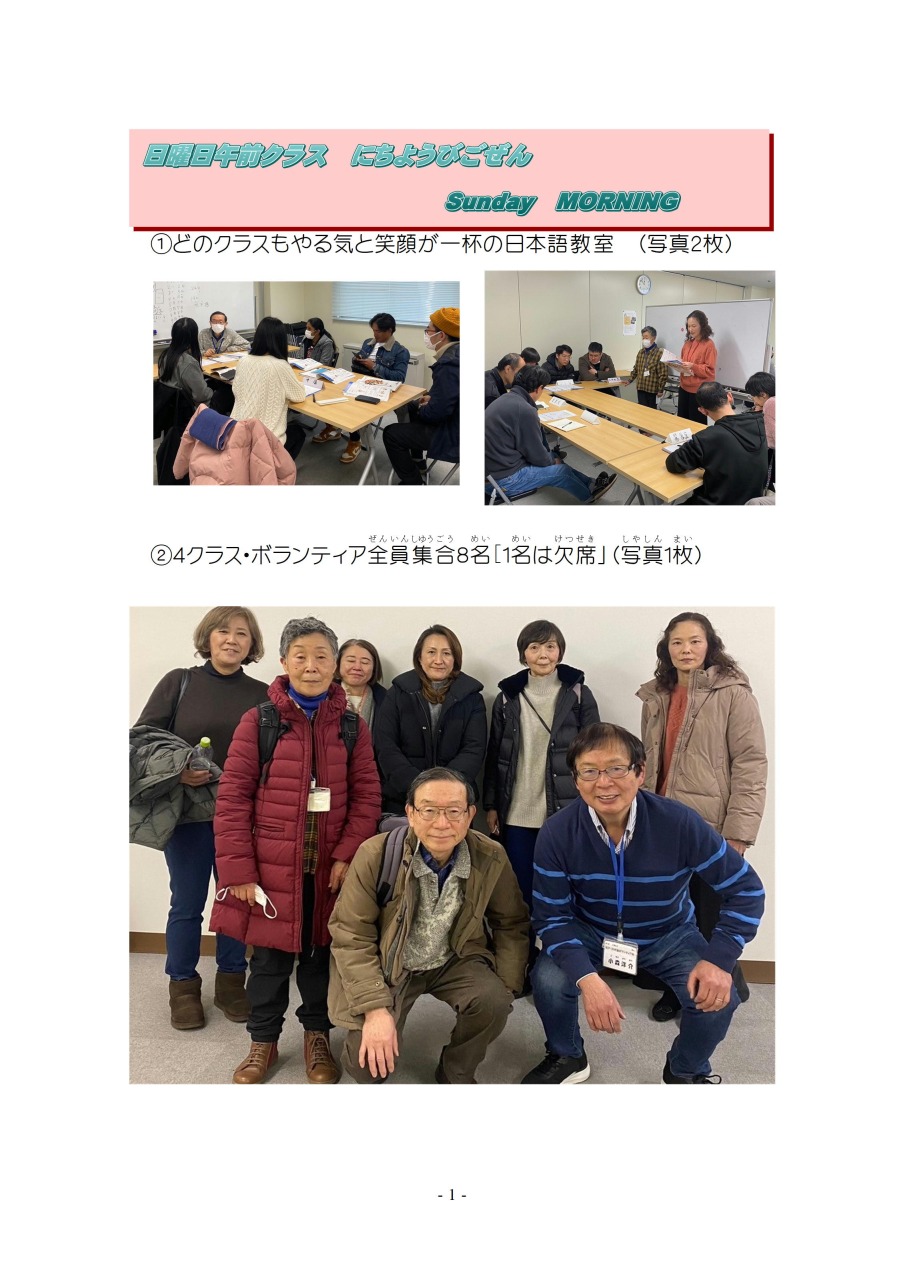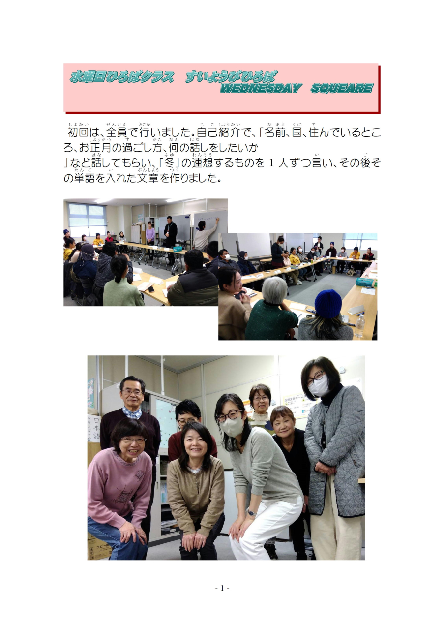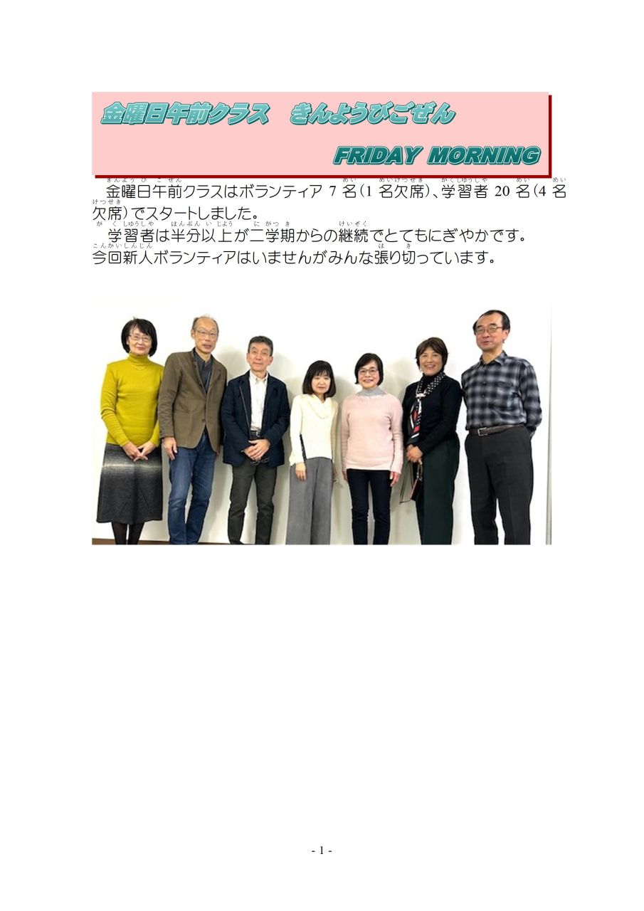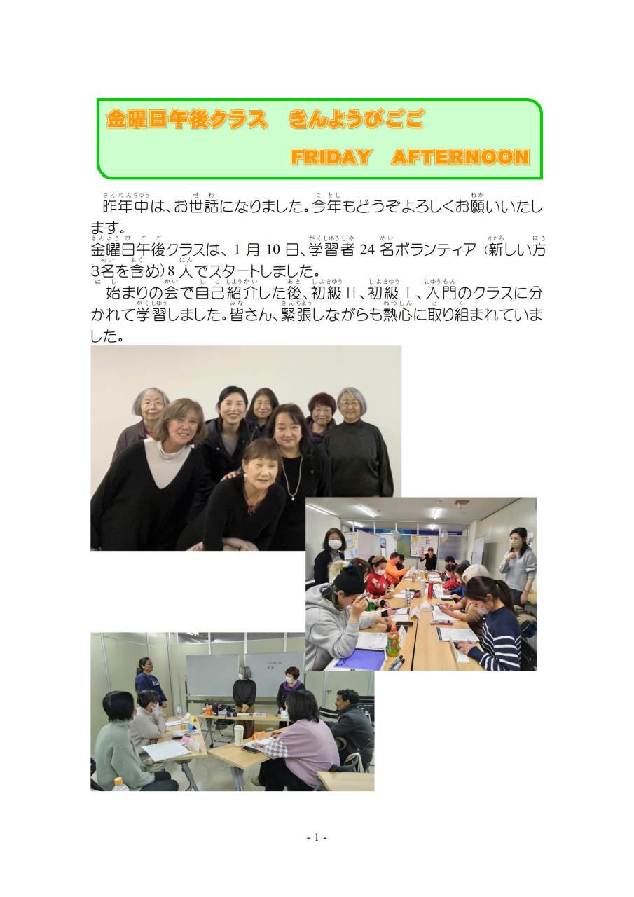 明(あ)けましておめでとうございます。今年(ことし)もよろしくお願(ねが)いします。三学期(さんがっき)が始(はじ)まりました。ボランティアの紹介(しょうかい)をかねて 一回目(いっかいめ)の授業(じゅぎょう)を ご報告(ほうこく)します。
