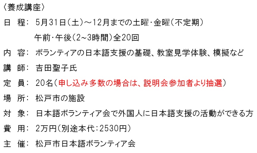 外国人が日本での生活に必要な日本語を話せるように支援するボランティア養成講座です。 日本語で教えるので、外国語(英語・中国語など)は必要ありません。